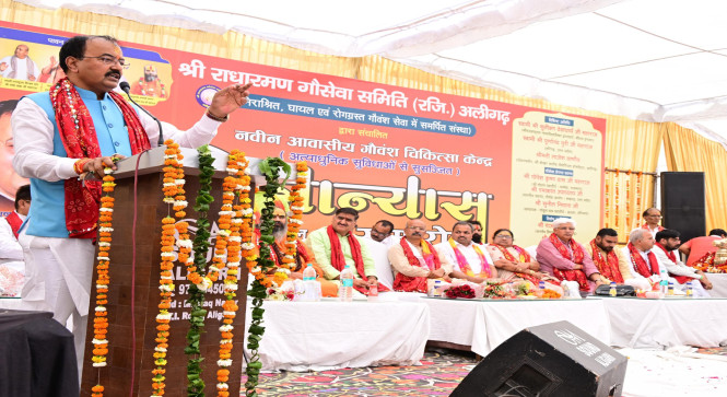 उत्तर प्रदेश के उप मुख्यमंत्री श्री केशव प्रसाद मौर्य ने अलीगढ़ के हाजीपुर चौहट्टा में राधारमण गौसेवा समिति के सौजन्य से स्थापित कराए जाने वाले नवीन आवासीय गौवंश चिकित्सा केंद्र का विधिवत शिलान्यास किया। यह केंद्र गोवंशों के संरक्षण, चिकित्सा एवं देखरेख के लिए अत्याधुनिक सुविधाओं से युक्त होगा। उपमुख्यमंत्री ने अपने उद्बोधन के दौरान गौवंश चिकित्सा केंद्र को स्वेच्छा से 01 लाख रूपये की धनराशि दान देने की घोषणा करते हुए चिकित्सा केंद्र के लिए भूमि दान करने वाले परिवारों का आभार प्रकट किया। उन्होंने गौमाता के प्रतीक पर माल्यार्पण कर कार्यक्रम का शुभारंभ किया। समारोह के उपरांत मुख्य अतिथि, जनप्रतिनिधियों, समिति सदस्यों ने पुरोहितगणों द्वारा किए जा रहे मंत्रोचार के साथ गौवंश चिकित्सा केंद्र की आधारशिला रखी।