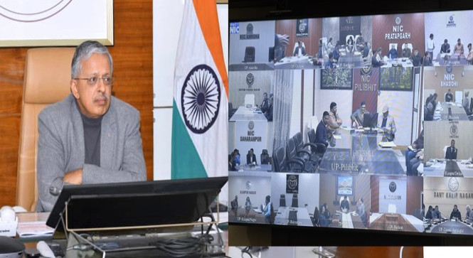 *लखनऊः* मुख्य सचिव श्री एस.पी.गोयल ने वीडियो कॉन्फेंसिंग के माध्यम से सभी मण्डालयुक्तों एवं जिलाधिकारियों के साथ साप्ताहिक समीक्षा बैठक कर महत्वपूर्ण दिशा-निर्देश दिए।