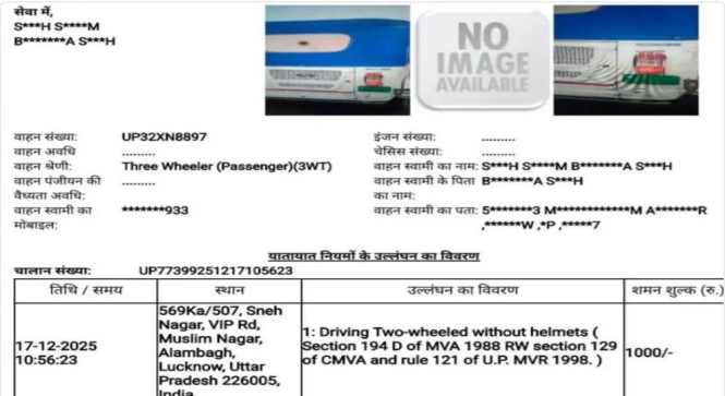 अन्य खबरे Dec 27, 2025 at 06:28 PM , 111लखनऊ-ई-रिक्शा का कटा ‘नो हेलमेट’ चालान, ट्रैफिक पुलिस की बड़ी चूक सामने