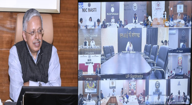 *लखनऊ।* मुख्य सचिव श्री एस.पी. गोयल ने आज वीडियो कॉन्फ्रेंसिंग के माध्यम से प्रदेश के सभी मण्डलायुक्तों एवं जिलाधिकारियों के साथ साप्ताहिक समीक्षा बैठक की। बैठक में ई-ऑफिस की क्रियाशीलता, खेल अवसंरचना विकास, विद्यालयों में बालिका शौचालयों की उपलब्धता, आंगनवाड़ी चयन प्रक्रिया तथा पंचायत उत्सव भवन निर्माण सहित विभिन्न महत्वपूर्ण विषयों की विस्तार से समीक्षा की गई।