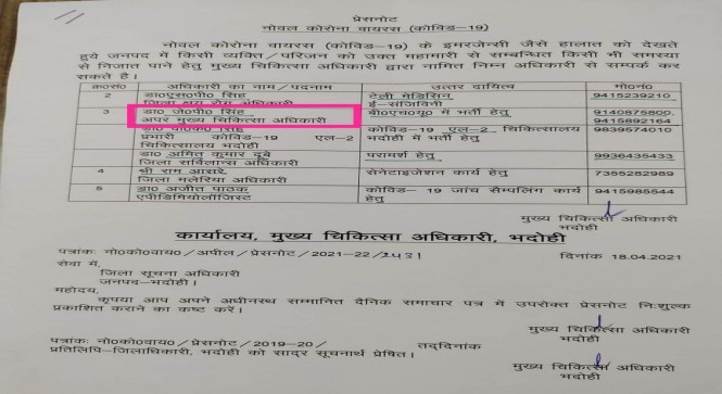 *भदोही-* कोरोना से जान गंवा चुके एडिशनल सीएमओ डॉ जेपी सिंह की स्वास्थ्य विभाग ने लगा दी कोविड मरीजों के परामर्श के लिए ड्यूटी , जारी कर दिया नाम और नम्बर, घर वाले फोन रिसीव कर हुए परेशान