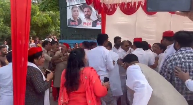 पूर्व मुख्यमंत्री अखिलेश यादव के स्वागत के लिए खड़े सपा विधायक मोहम्मद हसन रूमी और सपा नगर अध्यक्ष फजल महमूद के समर्थकों में हुई मारपीट।