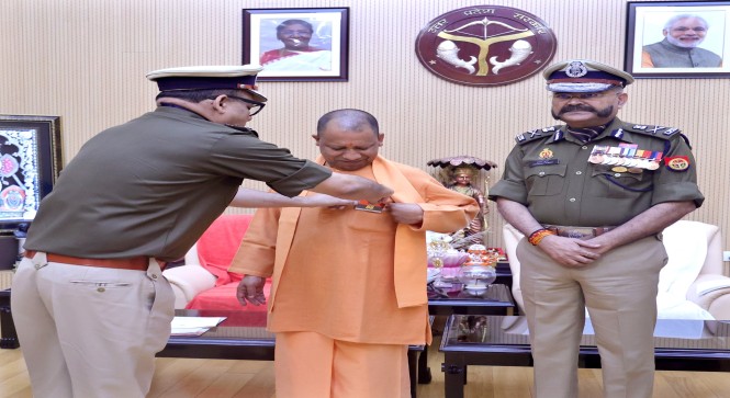 पुलिस झण्डा दिवस के अवसर पर कार्यवाहक DGP विजय कुमार ने मुख्यमंत्री योगी आदित्यनाथ को झण्डा लगाया