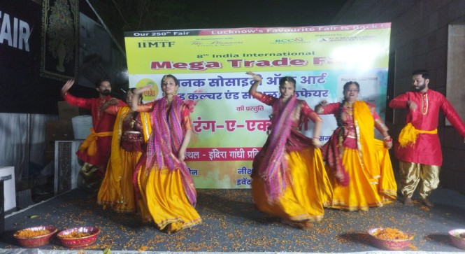 लखनऊ। “भारत अंतर्राष्ट्रीय मेगा ट्रेड फेयर” में बुधवार 20 मार्च को “धनक सोसाइटी” की ओर से “रंग-ए-एकादशी” कार्यक्रम का आयोजन किया गया। गोमती नगर स्थित इंदिरा गांधी प्रतिष्ठान में हुए इस सतरंगी कार्यक्रम में “धनक सोसाइटी ऑफ आर्ट एंड कल्चरल एंड सोशल वेलफेयर” के कलाकारों ने एक से बढ़कर एक नृत्य और गायन की प्रस्तुतियां दी। इस यादगार शाम में लोक गायकी के विविध रंग से लेकर फूलों की होली तक देखने को मिली।