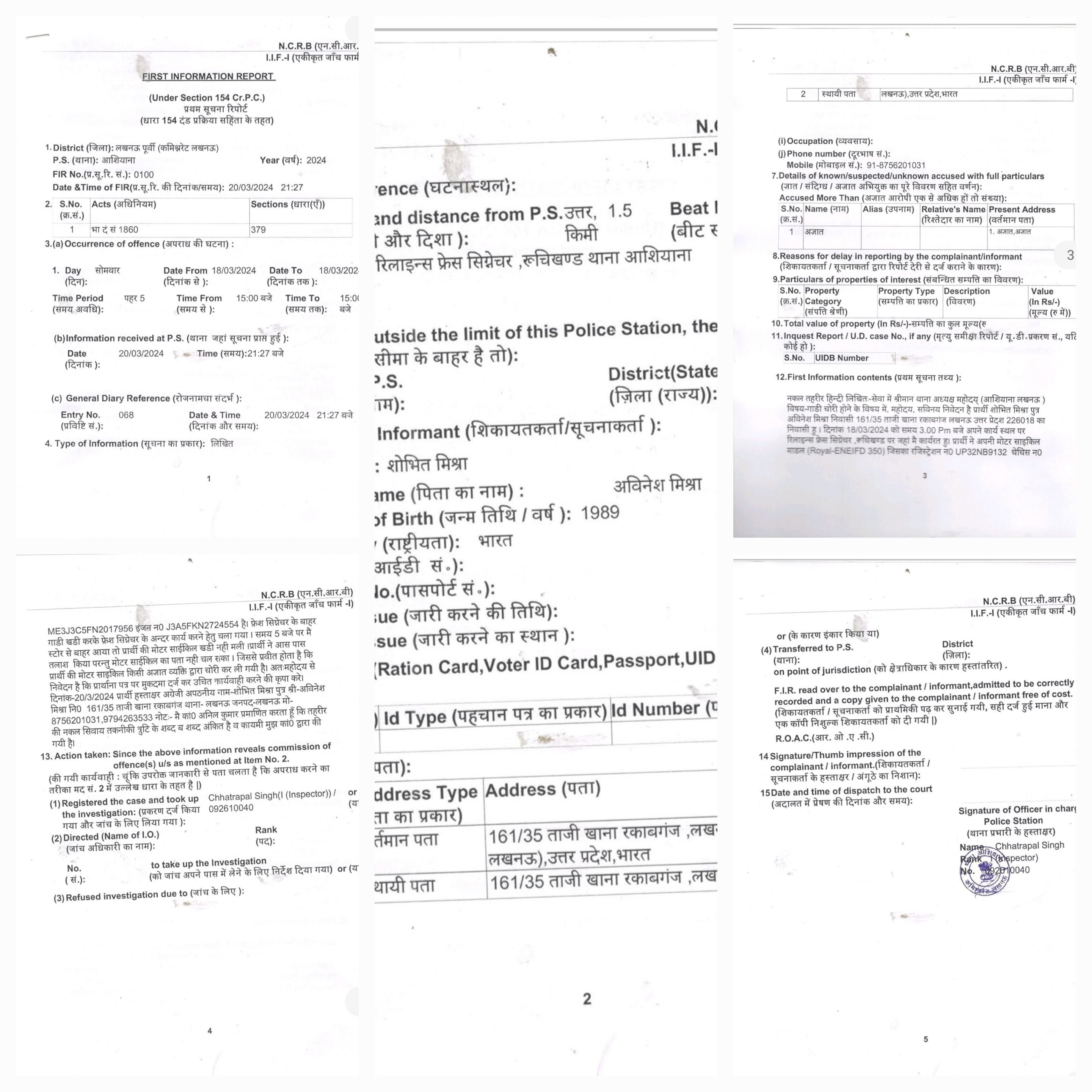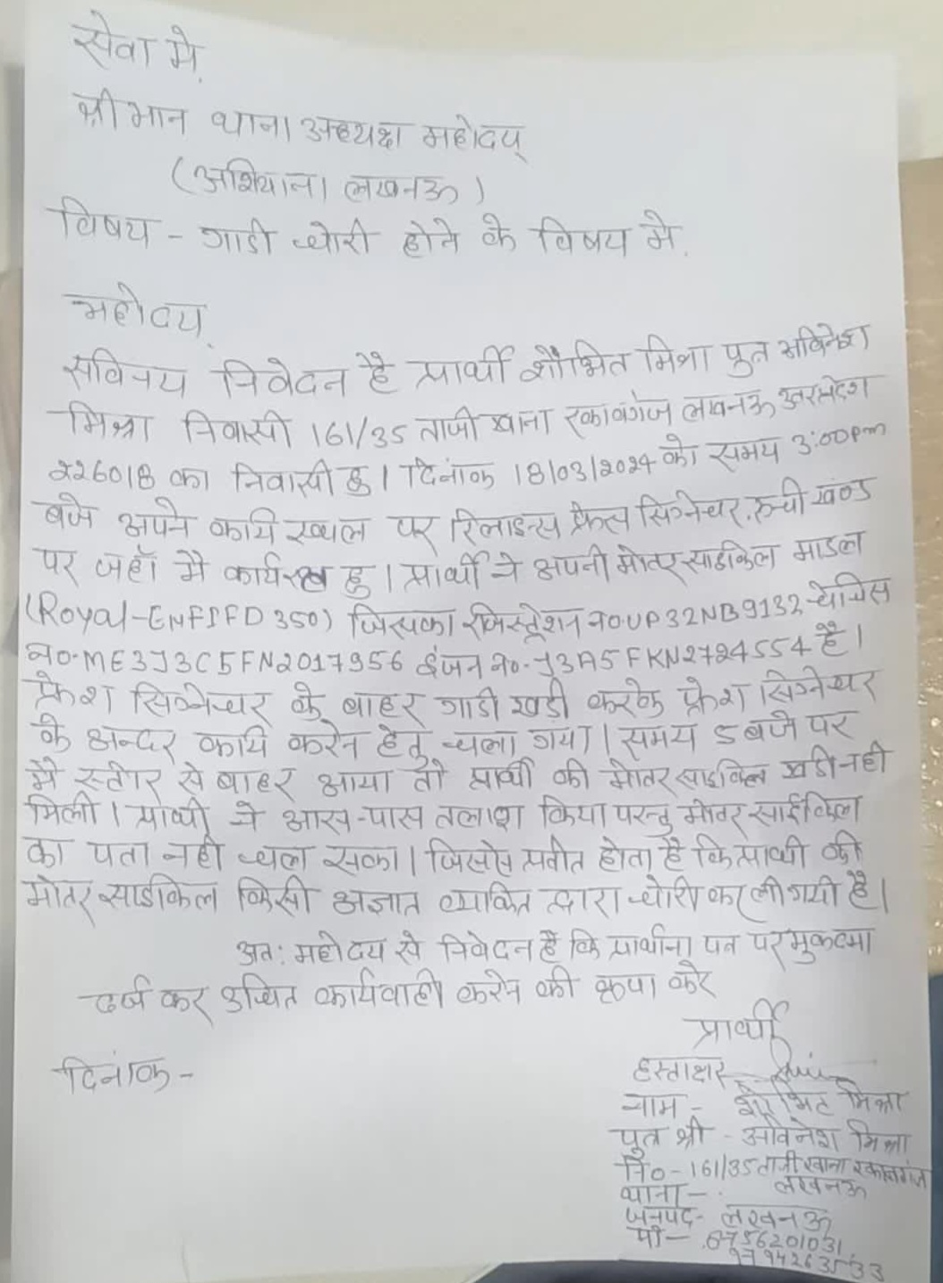 तलाश करने पर कोई सुराग न मिलने पर शोभित ने आशियाना पुलिस को सूचित किया। स्टोर के बाहर लगे सीसीटीवी कैमरे के फुटेज को देखने से पता चला कि मोटरसाइकिल कोई अज्ञात व्यक्ति चुरा कर ले जा रहा है। पीड़ित ने फुटेज के आधार पर कुछ दूरी तक उक्त मार्ग पर खोजबीन किया। अंतत: उसे मायूस होना पड़ा। तब जाकर उसने आशियाना पुलिस को सूचित किया। लेकिन आशियाना पुलिस पीड़ित को दो दिनो तक टहलाती रही सीसीटीवी फुटेज को भी नहीं देखा.. बड़ी मशक्कत के बाद दिनांक 20 मार्च 24 को आशियाना पुलिस ने मोटरसाइकिल चोरी के संबंध में शोभित से लिखित तहरीर लेकरअज्ञात व्यक्ति के खिलाफ धारा 379 के अधीन केस दर्ज कर लिया है।