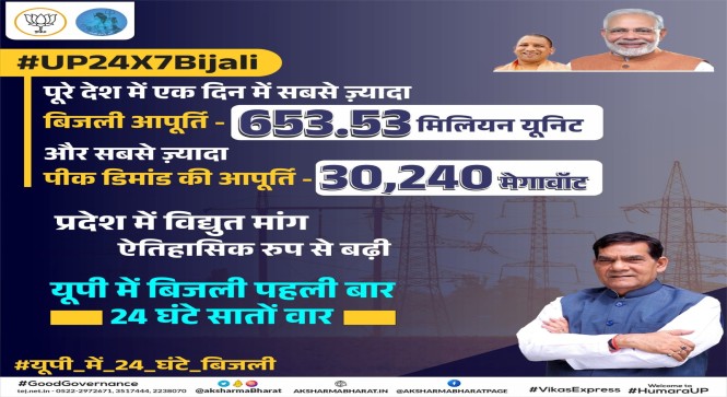 पूरे देश में एक दिन में सबसे ज्यादा 653.53 मि0 यूनिट बिजली आपूर्ति