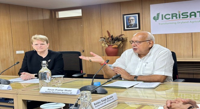 उत्तर प्रदेश के दल द्वारा कृषि मंत्री के नेतृत्व में गुरुवार को हैदराबाद में अर्ध-शुष्क उष्णकटिबंधीय क्षेत्रों के लिए अंतर्राष्ट्रीय फसल अनुसंधान संस्थान (ICRISAT) का भ्रमण किया गया तथा संस्थान के अधिकारियों के साथ बैठक की गई। ICRISAT में मूँगफली के अच्छे बीज हैं। उत्तर प्रदेश के बुंदेलखंड क्षेत्र में अच्छी मूंगफली की खेती होती है। ICRISAT के सहयोग से मूंगफली के उच्च प्रजाति के बीज से उत्तर प्रदेश में मूंगफली की खेती को बढ़ाया जाएगा। साथ ही ।CRISAT का एक उप केन्द्र उप्र0 में संचालित करने का भी अनुरोध किया। उ०प्र0 सरकार इसके लिए ICRISAT को भूमि उपलब्ध कराएगी। कृषि मंत्री ने कहा कि बाज़रा, ज्वार, सावाँ, कोदों और मडुवा के उच्च गुणवत्ता के बीज ICRISAT से उत्तर प्रदेश को मिले जिससे मिलेट्स की खेती को और बढ़ाया जा सके।