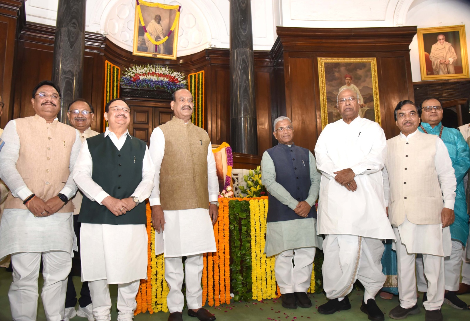 *श्री बिरला ने केन्द्रीय कक्ष में महात्मा गांधी और श्री लाल बहादुर शास्त्री को पुष्पांजलि अर्पित की*