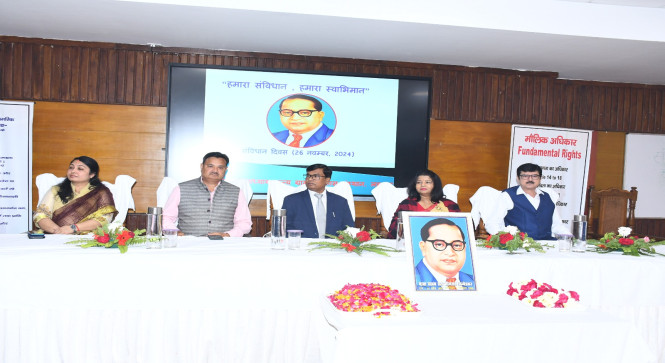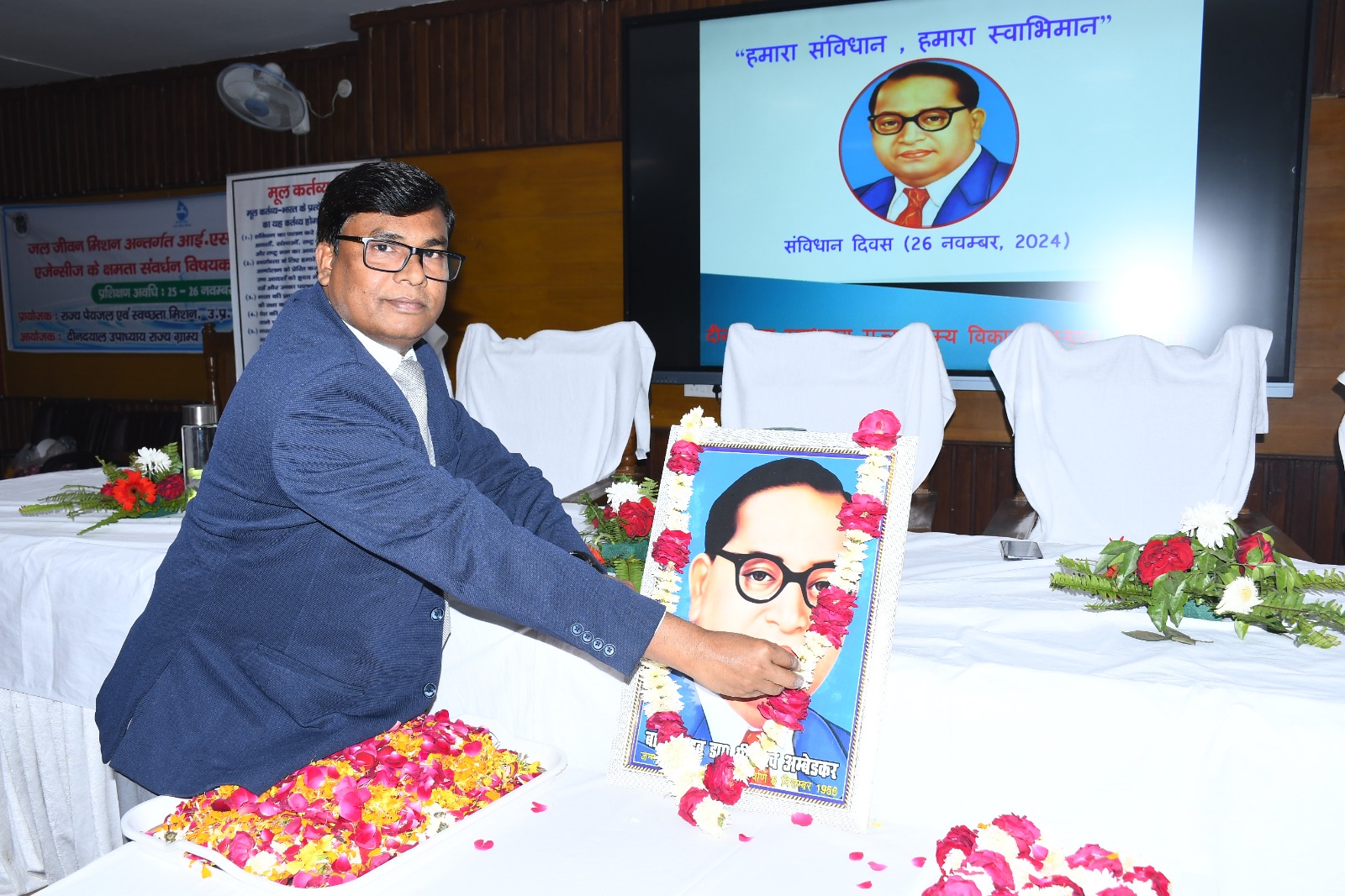 दीन दयाल उपाध्याय राज्य ग्राम्य विकास संस्थान द्वारा 26 नवम्बर, 2024 को 75वें भारतीय संविधान दिवस के पवित्र अवसर पर संस्थान के अपर निदेशक बी0डी0 चौधरी की अध्यक्षता में, संस्थान के समस्त अधिकारियों/कार्मिकों तथा अद्यतन रूप से संस्थान के अन्तर्गत संचालित हो रहे, समानान्तर चार प्रशिक्षण कार्यक्रमों के कुल लगभग 200 प्रतिभागियों की गरिमामयी उपस्थिति में, संविधान प्रलेखन समिति के अध्यक्ष बाबा साहब डा0 भीमराव अम्बेडकर के चित्र पर माल्यार्पण एवं पुष्पांजली स्वरूप श्रद्धा सुमन अर्पित करने के उपरान्त उपस्थित सभी लोगों को बी0डी0 चौधरी द्वारा, संविधान उद्देशिका आधारित संकल्पबद्धता की शपथ दिलायी गयी।