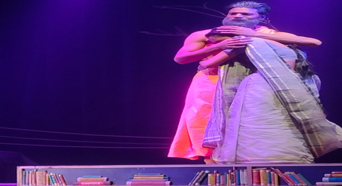 मंच पर एक ओर राम का स्तुति वंदन- श्री राम चन्द्र कृपालु भजमन.... गाया जा रहा था तो वहीं दृश्यबंध के नाम पर जो आठ-दस इंच के चार लेवल पुस्तक सजी अलमारी के रूप में तैयार किये गये थे। भले ही इनमें असल पुस्तकें न हों केवल रंग से ही पुस्तकों का आभास कराया जा रहा हो, पर इनमें दो लेवल पर रामायण पुस्तक भी प्रेक्षागृह में बैठे बैठे दिखायी दी। कलाकार उस लेवल पर चढ़कर, (जूते पहने भी) संवाद अदायगी करते रहे। आश्चर्य की बात यह है कि यह स्वयं राम की भूमि अवध में हो रहा है!