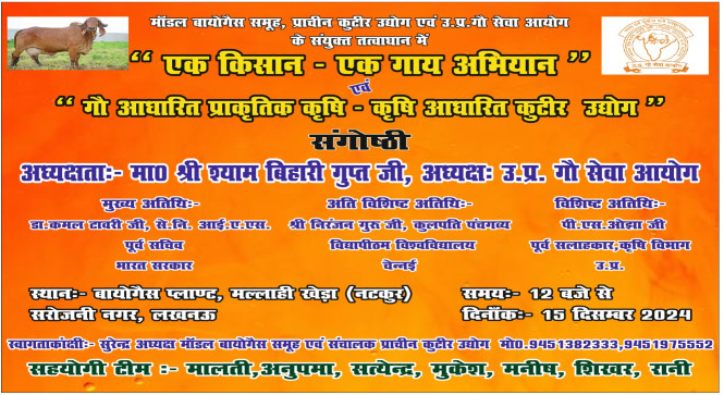 उत्तर प्रदेश गो सेवा आयोग एवं मॉडल बायोगैस समूह के संयुक्त तत्वाधान में गो सेवा आयोग के अध्यक्ष श्री श्याम बिहारी गुप्त जी की अध्यक्षता में कल 15 दिसंबर को बायोगैस प्लाण्ट, मल्लाही खेड़ा (नटकुर) सरोजनी नगर, लखनऊ में दोपहर १२ बजे से एक संगोष्ठी आयोजित की जा रही है ।