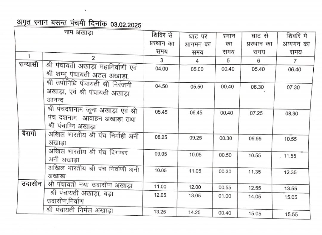 मेलाधिकारी महाकुम्भ श्री विजय किरन आनंद ने महाकुंभ प्रयागराज 2025 के बसन्त पंचमी स्नान (03 फरवरी 2025) के लिए अखाड़ों के परंपरागत अमृत स्नान की संषोधित समय-सारिणी जारी की है। जिसकेे अनुसार सन्यासी अखाड़ों में श्री पंचायती अखाड़ा महानिर्वाणी एंव श्री षम्भू पंचायती अटल अखाड़ा के लिए शिविर से प्रस्थान का समय सुबह 04ः00 बजे निर्धारित किया गया है। घाट पर इनका आगमन 05ः00 बजे होगा, और स्नान 40 मिनट तक चलेगा। इसके बाद घाट से प्रस्थान 05ः40 बजे होगा और 06ः40 बजे तक यह अखाड़े अपने शिविर में वापस पहुंचेंगे। श्री तपोनिधि पंचायती श्री निरंजनी अखाड़ा एवं श्री पंचायती अखाड़ा आनंद का षिविर से प्रस्थान का समय पूर्वाह्न 4ः50 बजे, घाट पर इनका आगमन 5ः50 बजे, घाट से प्रस्थान का समय 6ः30 बजे और षिविर में आगमन का समय 7ः30 बजे निर्धारित है। इसी प्रकार श्री पंचदशनाम जूना अखाड़ा, श्री पंच दशनाम आवाहन अखाड़ा और श्री पंचाग्नि अखाड़ा का षिविर से प्रस्थान का समय 05ः45 बजे, घाट पर पहुचने का समय 6ः45 बजे, घाट से वापस प्रस्थान का समय 7ः25 बजे और षिविर में आने का समय 8ः30 बजे है।