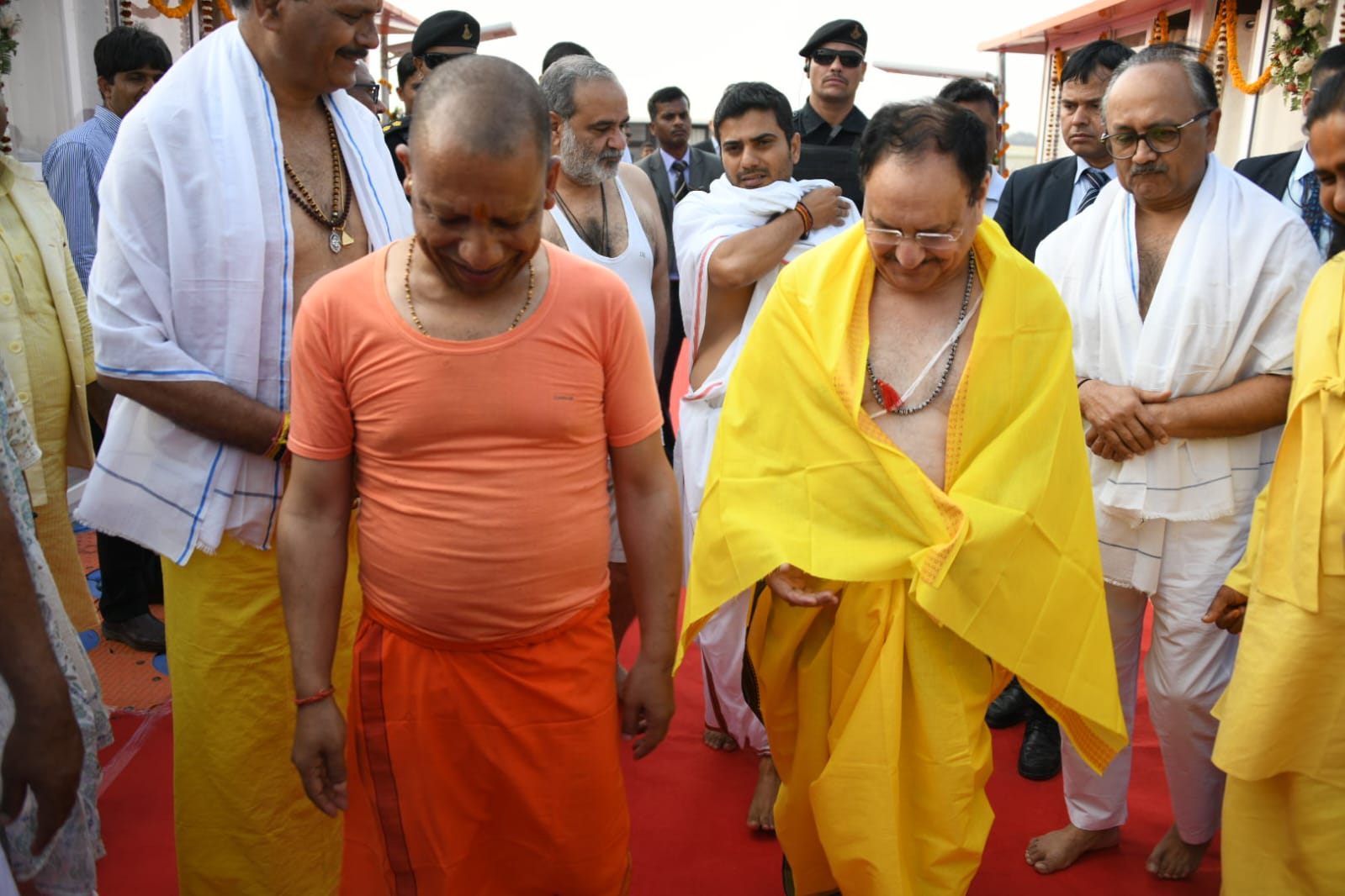 स्नानोपरांत नड्डा परिवार, सीएम योगी और बीजेपी के अन्य नेताओं ने विधि-विधान के साथ मां गंगा की पूजा अर्चना की। मुख्यमंत्री योगी आदित्यनाथ ने प्रदेश की जनता के कल्याण की कामना की। यहां से सभी नेतागण बड़े हनुमान मंदिर पहुंचे, जहां लेटे हनुमान जी की साविधि पूजा-अर्चना की। वहीं इसके बाद सभी ने अक्षयवट के भी दर्शन-पूजन किये।