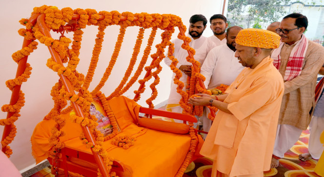 चैत्र (वासंतिक) नवरात्र की नवमी तिथि पर गोरखनाथ मंदिर में कन्या पूजन का अनुष्ठान पूर्ण करने के बाद मुख्यमंत्री मंदिर परिसर स्थित रामदरबार पहुंचे। यहां प्रतिष्ठित विग्रहों का पूजन किया और आरती उतारी। इसके बाद वह मंदिर परिसर के ओपन एयर थिएटर के मंच पहुंचे। यहां दोपहर के बारह बजते ही उन्होंने पालने में विराजमान प्रभु श्रीराम के बाल स्वरूप के विग्रह की वैदिक मंत्रोच्चार के बीच पूजा अर्चना की। प्रभु विग्रह को तिलक लगाने और माल्यार्पण करने के बाद आरती उतारी। पूजन का अनुष्ठान पूर्ण करने के साथ सीएम योगी ने बाल स्वरूप भगवान को पालने में झुलाया। इस अवसर पर मुख्यमंत्री ने भगवान श्रीराम से लोकमंगल की प्रार्थना की। रामोत्सव के कार्यक्रम में काशी से पधारे जगद्गुरु स्वामी संतोष दास उर्फ सतुआ बाबा व अनेक भक्त उपस्थित रहे।