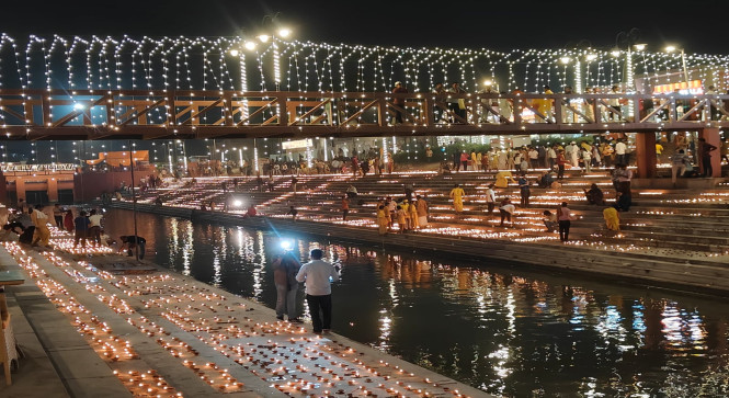 देर शाम को पर्यटन विभाग की ओर से चौधरी चरण सिंह घाट पर दीपोत्सव का भव्य आयोजन किया गया। इस दौरान 2.51 लाख दीपों को प्रज्वलित करने का लक्ष्य रखा गया, जिसे शिक्षा विभाग की तरफ से लगभग 800 स्कूली बच्चों की कड़ी मेहनत से पूरा किया गया। सदर विधायक वेद प्रकाश गुप्ता ने चौधरी चरण सिंह घाट पर प्रथम दीप प्रज्वलित कर उत्सव का शुभारंभ किया। जैसे ही दीपों की जगमगाहट से घाट प्रकाशित हुए, वातावरण में "जय श्री राम" के जयकारों की गूंज उठी। घाट पर बनाई गई आकर्षक प्रभु श्री राम की रंगोलियों ने श्रद्धालुओं और पर्यटकों का मन मोह लिया। देर शाम तक लोग यहां पहुंचते रहे और सेल्फी लेते हुए इस ऐतिहासिक पल को अपने कैमरों में कैद करते नजर आए। योगी सरकार के नेतृत्व में अयोध्या को त्रेता युग के स्वरूप में ढालने का प्रयास जारी है, जिससे भगवान श्रीराम के समय की पवित्रता और आध्यात्मिकता का अनुभव कराया जा रहा है।