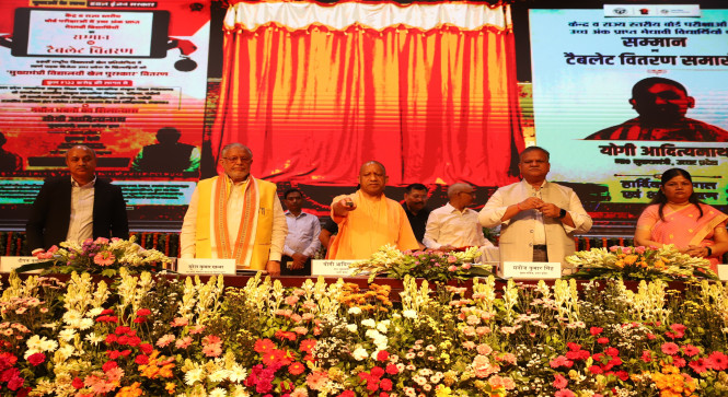 प्रदेश की मेरिट सूची में स्थान प्राप्त करने वाले छात्र-छात्राओं को 01 लाख रु0 नकद, टैबलेट, मेडल तथा प्रशस्ति पत्र प्रदान किये जा रहे