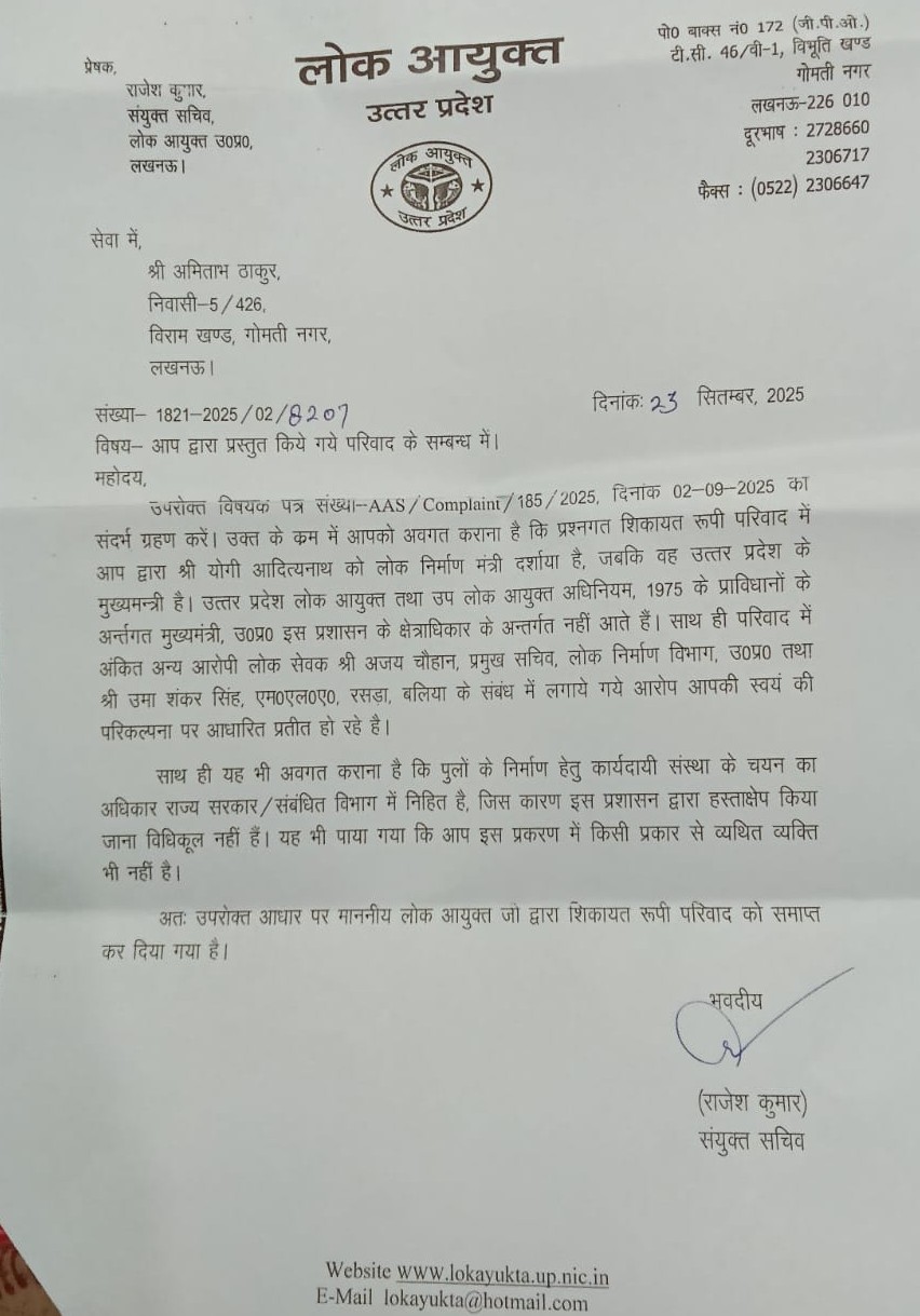 लोकायुक्त ने कहा है कि पुल की कार्यदायी संस्था तय करने का अधिकार राज्य सरकार को है, जिस पर लोकायुक्त का हस्तक्षेप उचित नहीं है. उन्होंने यह भी कहा कि अमिताभ ठाकुर इस मामले में किसी भी प्रकार से व्यथित व्यक्ति नहीं हैं.।