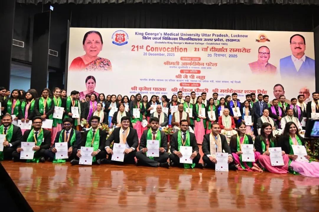 जनपत की खबर Dec 20, 2025 at 04:20 PM , 130लखनऊ। किंग जॉर्ज मेडिकल यूनिवर्सिटी (KGMU), लखनऊ का 21वां दीक्षांत समारोह अटल बिहारी वाजपेयी वैज्ञानिक कन्वेंशन सेंटर में भव्य रूप से आयोजित किया गया। समारोह की अध्यक्षता उत्तर प्रदेश की राज्यपाल एवं कुलाधिपति श्रीमती आनंदीबेन पटेल ने की।