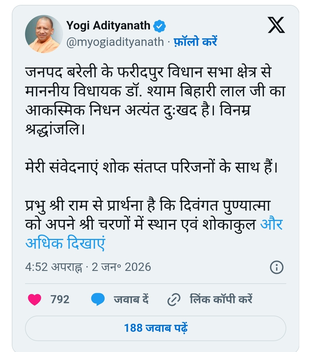 मुख्यमंत्री योगी आदित्यनाथ ने भी उनके आकस्मिक निधन पर गहरा शोक व्यक्त किया है। मुख्यमंत्री ने सोशल मीडिया प्लेटफॉर्म ‘एक्स’ पर लिखा, “मेरी संवेदनाएं शोक संतप्त परिजनों के साथ हैं। प्रभु श्रीराम से प्रार्थना है कि दिवंगत पुण्यात्मा को अपने श्रीचरणों में स्थान दें और शोकाकुल परिवार को इस अथाह दुःख को सहन करने की शक्ति प्रदान करें।”