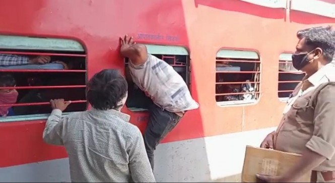 दरवाजे से जगह न मिलने पर ट्रेन की खिड़की से अंदर घुसने को मजबूर लोग