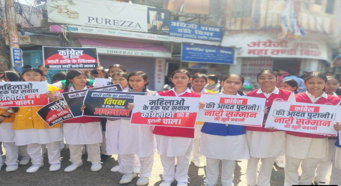 तस्वीर में स्कूल ड्रेस पहनी नन्हीं छात्राएं हाथों में राजनीतिक नारों वाली तख्तियां लेकर सड़क पर प्रदर्शन करती दिख रही हैं। स्कूल समय में बच्चों को राजनीतिक नारेबाजी के लिए सड़कों पर उतारने से हर कोई हैरान है।