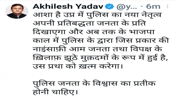 आशा है उप्र में पुलिस का नया नेतृत्व अपनी प्रतिबद्धता जनता के प्रति दिखाएगा और अब तक के भाजपा काल मे पुलिस के द्वारा जिस प्रकार की नाइंसाफी आम जनता तथा विपछ के खिलाफ झूठे मुकदमो के रूप में हुवी है उस प्रथा को खत्म करेगा ।