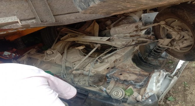 ओमनी वैन ट्रक के नीचे दबी, राहत कार्य जारी। मौके पर भारी पुलिस बल मौजूद।