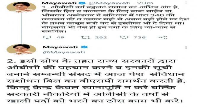 2. इसी सोच के तहत राज्य सरकारों द्वारा ओबीसी की पहचान करने व इनकी सूची बनाने सम्बन्धी संसद में आज पेश संविधान संशोधन बिल का बीएसपी समर्थन करती है, किन्तु केन्द्र केवल खानापूर्ति न करे बल्कि सरकारी नौकरियों में ओबीसी के वर्षों से खाली पदों को भरने का ठोस काम भी करे।