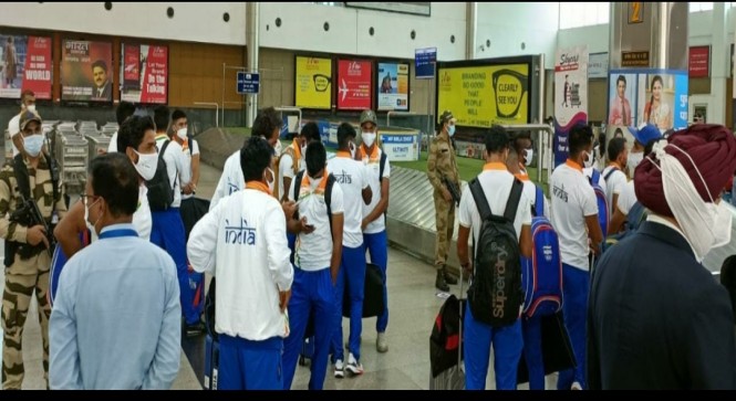 प्रशासन और खेल विभाग से जुड़े अधिकारियों ने एयरपोर्ट पर खिलाड़ियों का किया स्वागत,