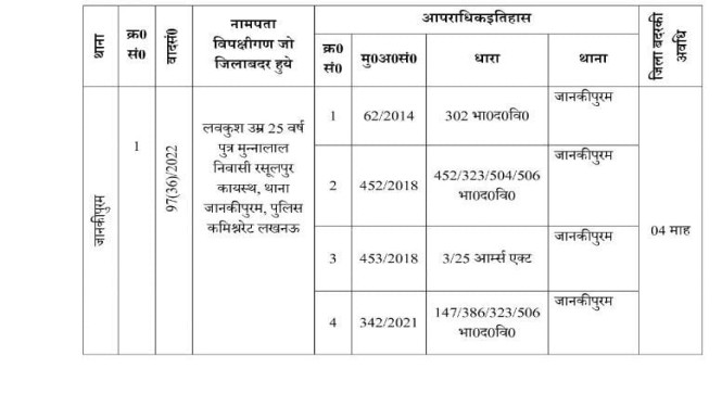 पुलिस कमिश्नरेट लखनऊ की सीमा से 04 माह के लिए किया गया जिला बदर।
