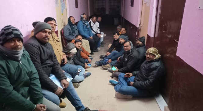 कड़कती ठन्ड में वित्त एवं लेखाधिकारी बेसिक शिक्षा लखनऊ के कार्यालय पर धरने पर बैठे शिक्षक