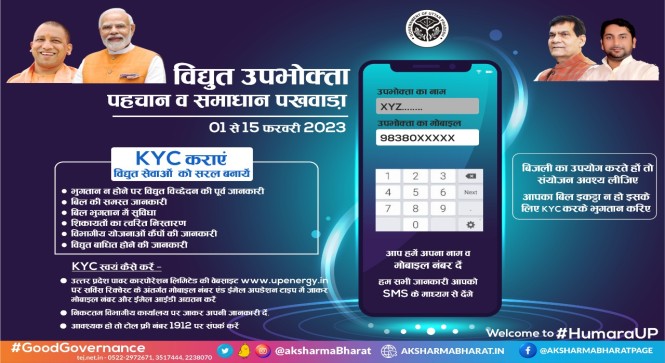 ऊर्जा मंत्री श्री ए0के0 शर्मा ने कहा कि ‘नो योर कस्टुमर’ अभियान के दौरान उपभोक्ता उत्तर प्रदेश पावर कारपोरेशन की वेबसाइट www.upenergy.in पर जाकर अपना मोबाइल नम्बर व ई-मेल आईडी अपडेट कर सकते हैं। अपने नजदीकी बिजली विभाग के कार्यालय पर जाकर भी जानकारी दे सकते हैं। विभाग के टोल फ्री नम्बर 1912 पर भी इसके लिए सम्पर्क कर सकते हैं। उन्होंने कहा कि किसी भी समस्या पर या इसके त्वरित समाधान के लिए उपभोक्ताओं को समय पर विद्युत् सम्बंधी सन्देश भेजने के लिए उनका संपर्क नंबर, ईमेल आईडी होना बहुत आवश्यक है। इससे उन्हें बिल न जमा होने, विद्युत बाधित होने, बिजली कटने, बिल की जानकारी देने, डिस्कनेक्शन, शिकायतों का त्वरित निस्तारण करने तथा बिल भुगतान में सुविधा होगी।