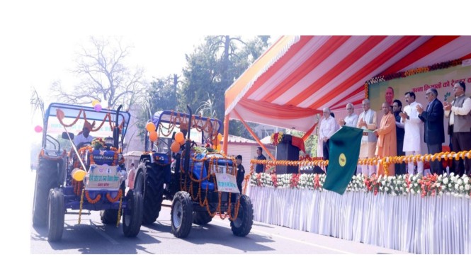 मुख्यमंत्री ने प्रदेश की सहकारी गन्ना एवं चीनी मिल समितियों में स्थापित फार्म मशीनरी बैंकों हेतु 77 टै्रक्टर को हरी झण्डी दिखाकर रवाना किया