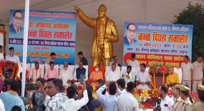 जनपत की खबर Apr 14, 2023 at 05:17 PM , 172लखनऊ 14 अप्रैल 2023 डा0 आंबेडकर महासभा परिसर लखनऊ में भारतरत्न बोधिसत्व बाबा साहेब डा0 आंबेडकर महासभा के तत्वावधान में आज आंबेडकर जयंती पर एक विशेष समारोह आयोजित किया गया था। इस समारोह में मुख्य अतिथि के रूप में प्रदेश के मा0 मुख्यमंत्री श्री योगी आदित्यनाथ जी सम्मिलित हुए। उन्होंने आंबेडकर महासभा में स्थापित बाबा साहेब डा0 आंबेडकर के अस्थि कलश पर पुष्पार्पण किया तथा डा0 आंबेडकर की प्रतिमा पर माल्यार्पण किया। समारोह को सम्बोधित करते हुए श्री योगी आदित्यनाथ जी ने कहा कि डा0 आंबेडकर ने भारतीय संविधान लिखकर इस देश के गरीबों, वंचितों, दलितों की आवाज को मजबूत करने का कार्य किया तथा देश की एकता और अखण्डता अच्छुण रहे इसके लिए एक समावेशी संविधान बनाया।