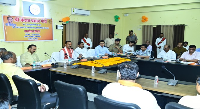 उत्तर प्रदेश के उप मुख्यमंत्री, श्री केशव प्रसाद मौर्य द्वारा कलेक्ट्रेट सभागार में जनपद चंदौली मे पुलिस, प्रशासनिक एवं विभागीय अधिकारियों के साथ समीक्षा बैठक की गई। बैठक के दौरान उपमुख्यमंत्री ने सिंचाई विभाग के अधिशासी अभियंता को निर्देशित करते हुए कहा कि जनपद में धान की खेती हेतु किसानों के खेतों तक सिंचाई हेतु पर्याप्त पानी की उपलब्धता के लिए समस्त आवश्यक प्रबंध कर लिए जाएं। नहरों का पानी टेल तक पहुंचे ,इसके लिए आवश्यक कार्रवाई सुनिश्चित किया जाए। उन्होंने लो वोल्टेज के चलते पंप कैनालो की पूरी क्षमता के साथ नहीं चलने की समस्या के निराकरण हेतु जिलाधिकारी एवं संबंधित अधिकारियों को निर्देशित करते हुए कहा कि तत्काल आवश्यक बैठक कर समस्या का समुचित समाधान किया जाए ,जिससे नहरों द्वारा किसानों को खेती हेतु पर्याप्त पानी उपलब्ध हो सके। उन्होंने चंद्रप्रभा बांध के लीकेज को दुरुस्त करने हेतु युद्ध स्तर पर कार्यवाही किए जाने के निर्देश दिए। जल जीवन मिशन के अंतर्गत हर घर नल से जल योजना से ग्राम पंचायतों को आच्छादित करने हेतु शीघ्रता से कार्यवाही किए जाने पर जोर दिया। उन्होंने नौगढ़ क्षेत्र में पानी की किल्लत के दृष्टिगत पर्याप्त मात्रा में पानी उपलब्ध कराए जाने हेतु जिला पंचायत राज अधिकारी को निर्देशित करते हुए कहा कि पानी के अतिरिक्त टैंकरों द्वारा आम लोगों की जरूरतों हेतु पेयजल उपलब्ध कराया जाना सुनिश्चित करें। उन्होंने कहा कि जनपद में कहीं भी पेयजल की कोई समस्या न हो यह सुनिश्चित किया जाए। जनपद में क्राइम, चोरी आदि की घटनाओं को रोकने हेतु प्रभावी कार्यवाही किए जाने के निर्देश पुलिस अधीक्षक को दिए। उन्होंने कहा कि अवैध गोवंश की तस्करी पर पूर्णतः रोक लगाई जाए एवं इसमें संलिप्त लोगों पर कठोर से कठोर कार्रवाई सुनिश्चित हो। सहायक सम्भागीय परिवहन अधिकारी को निर्देशित करते हुए उप मुख्यमंत्री ने कहा कि जनपद में अवैध/ ओवरलोड वाहनों के विरुद्ध कार्यवाही किए जाय। उपमुख्यमंत्री ने जनपद में विद्युत सप्लाई की पर्याप्त व्यवस्था के साथ ही रोस्टर के अनुसार विद्युत सप्लाई प्रत्येक दशा में सुनिश्चित किए जाने के निर्देश दिए। उन्होंने अवशेष मजरों में अभियान चलाकर 1 सप्ताह के अंदर विद्युतीकरण की कार्यवाही पूर्ण किये जाने के निर्देश दिए। उन्होंने सख्त रूप से निर्देशित करते हुए कहा कि विद्युत चोरी के नाम पर अवैध वसूली की शिकायत प्राप्त होने पर संबंधित कर्मी के खिलाफ कठोर कार्यवाही सुनिश्चित की जाएगी। उप मुख्यमंत्री ने जनपद में चारागाह, चक मार्गो, जलाशयों पर हुए अवैध कब्जों को अभियान चलाकर चिन्हित कर कब्जा मुक्त कराने के कड़े निर्देश दिए,कहा कि कब्जे से खाली कराई गई जम