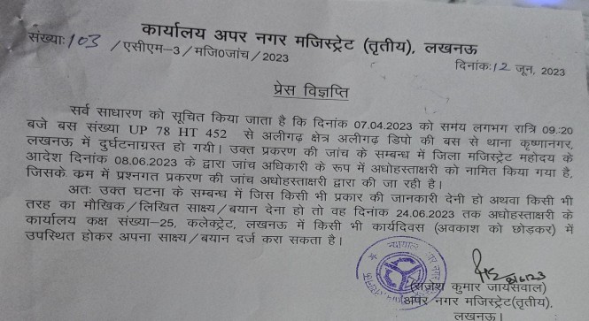 अपर नगर मजिस्ट्रेट(तृतीय) लखनऊ श्री राजेश कुमार जायसवाल ने बताया कि दिनांक 07 अप्रैल 2023 को समय लगभग रात्रि 09.20 बजे बस संख्या यू0पी0 78 एच0टी0 452 से अलीगढ़ क्षेत्र अलीगढ़ डिपो की बस से थाना कृष्णानगर, लखनऊ में दुर्घटनाग्रस्त हो गयी। उक्त प्रकरण की जांच के सम्बन्ध में जिला मजिस्ट्रेट महोदय के आदेश दिनांक 08 जून 2023 के द्वारा जांच अधिकारी के रूप में अधोहस्ताक्षरी को नामित किया गया है। जिसके क्रम में प्रश्नगत प्रकरण की जांच अधोहस्ताक्षरी द्वारा की जा रही है।