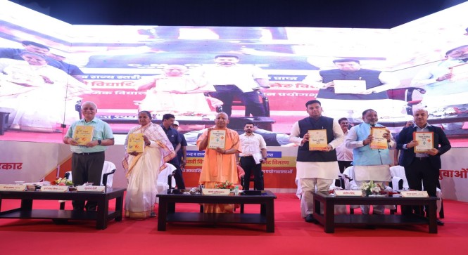 केन्द्र व राज्यस्तरीय बोर्ड परीक्षाओं में उच्च अंक प्राप्त करने वाले 1745 मेधावी विद्यार्थियों का सम्मान एवं टैबलेट वितरण तथा 18 राजकीय माध्यमिक विद्यालयों के भवनों व 125 विज्ञान प्रयोगशालाओं का लोकार्पण करते मुख्यमंत्री योगी आदित्यनाथ .